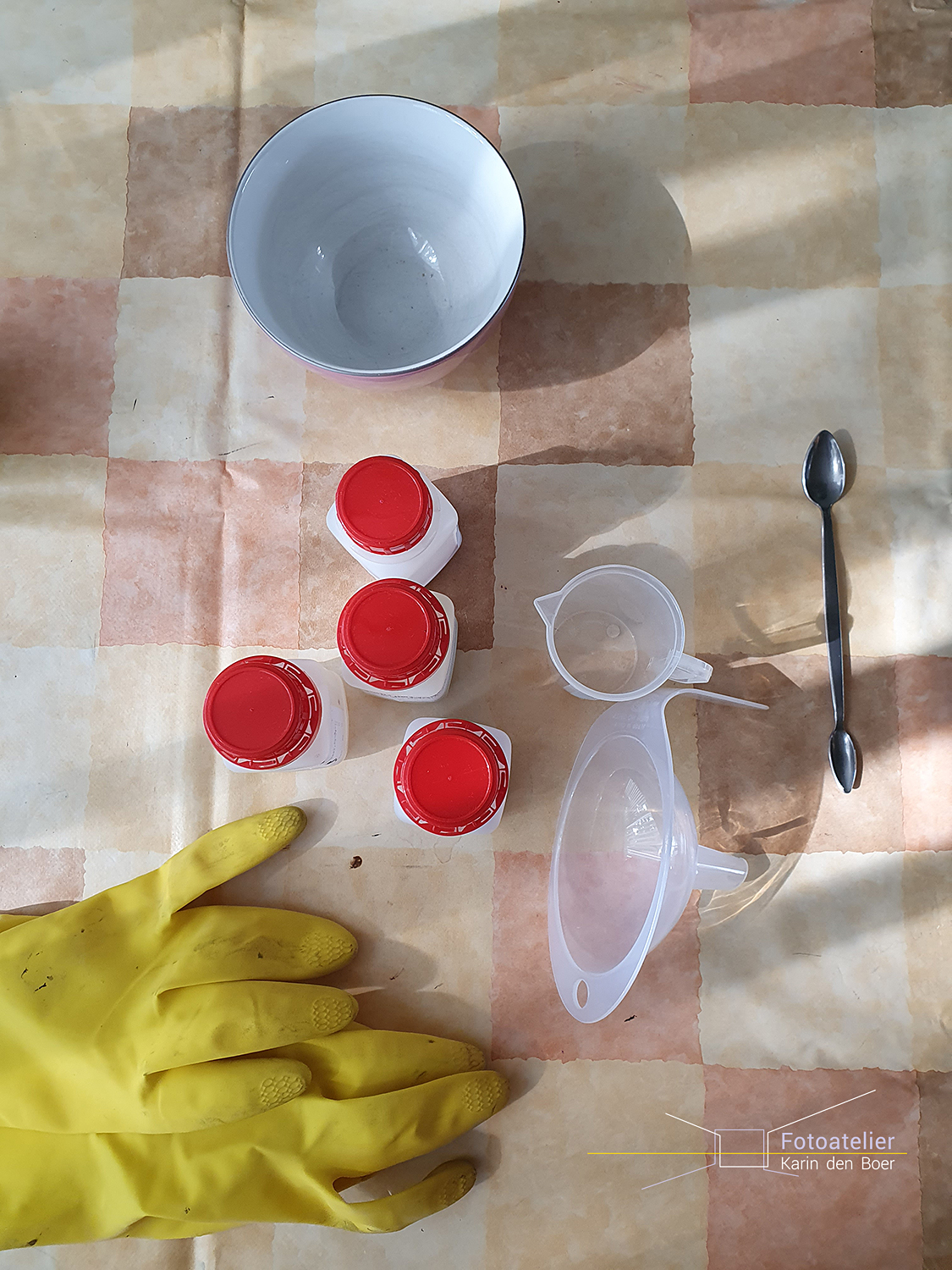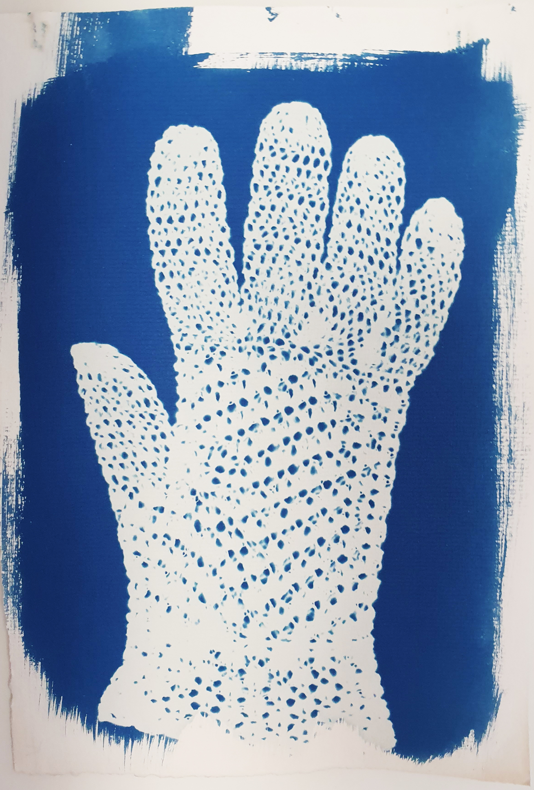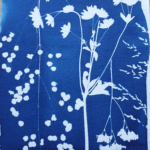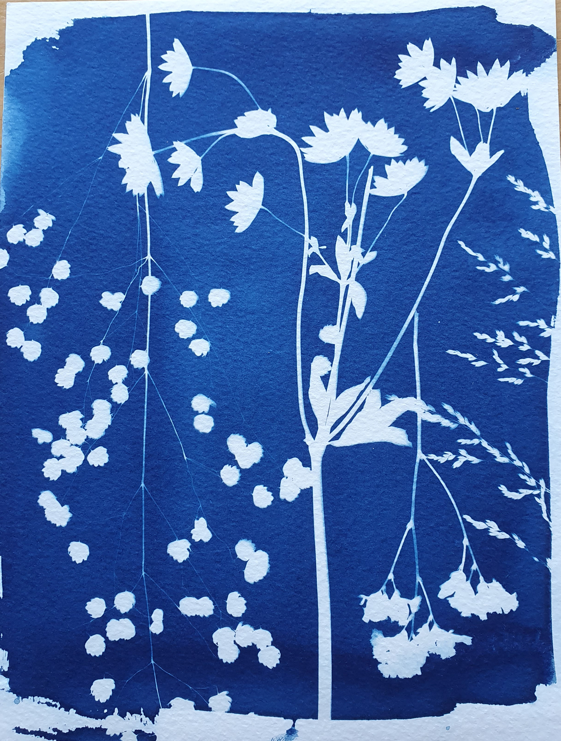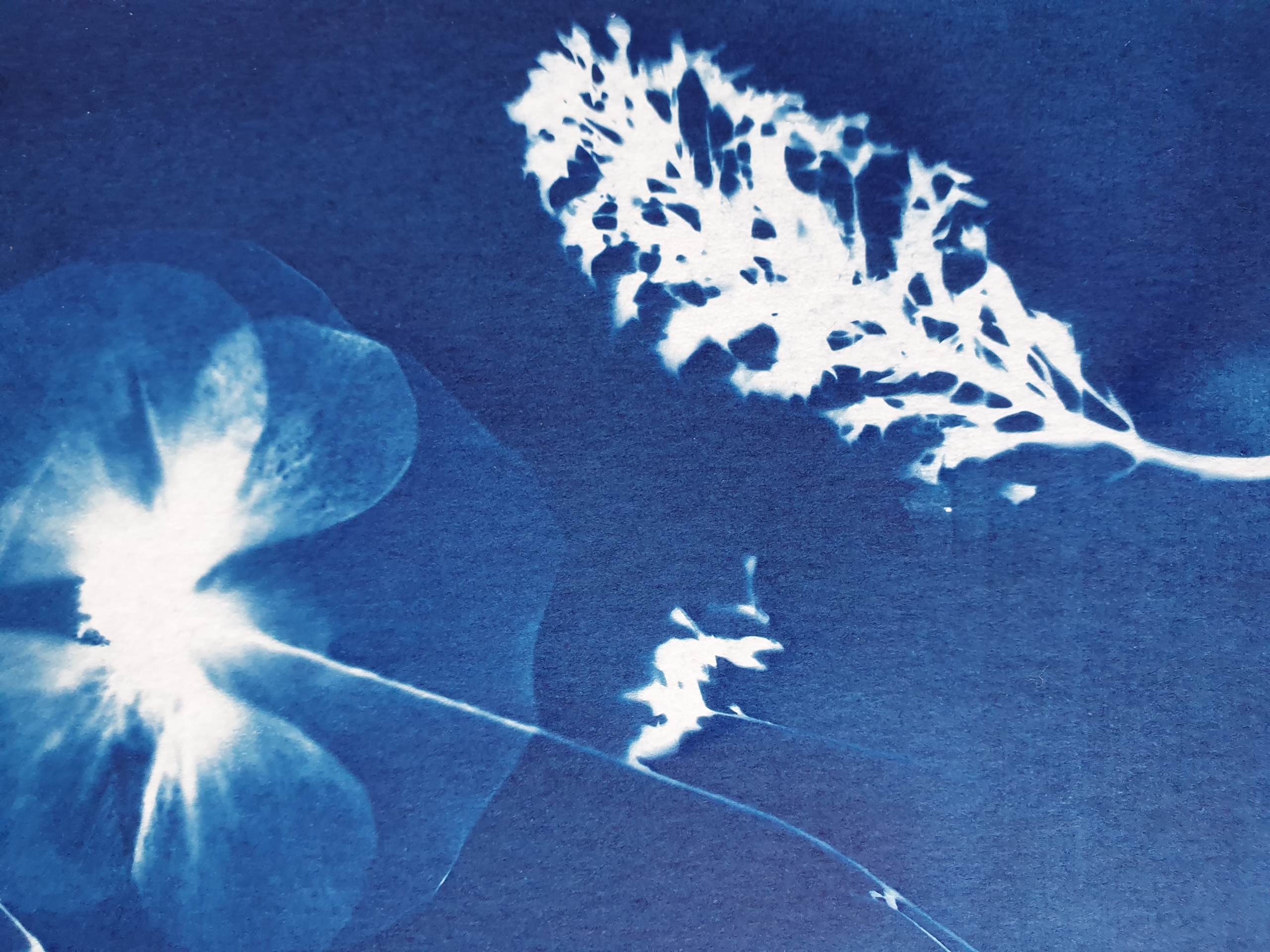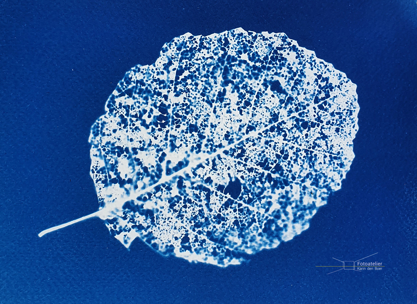 In deze workshop gaan we twee chemicaliën blootstellen aan UV licht, waardoor ze veranderen in een blauwe kleur. De gedeelten die niet blootgesteld worden aan het licht blijven wit of de kleur van de ondergrond. In ons geval het wit van het papier. Zo ontstaan er door de vormen van de bladeren of bloemen mooie composities met een intens blauwe achtergrond. Naast bladeren en bloemen kun je ook gebruik maken van oude negatieven afgedrukt op sheets.
